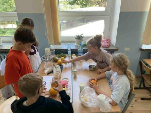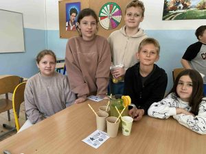 Na lekcji pachniało cytrusami i miętą, ponieważ to główne składnikI zdrowego napoju. Dziewczęta i chłopcy z wielkim zaangażowaniem wyciskali sok, przygotowywali mieszaninę oraz doprawiali ją do smaku. Na zakończenie warsztatów kulinarnych odbyła się wspólna degustacja.