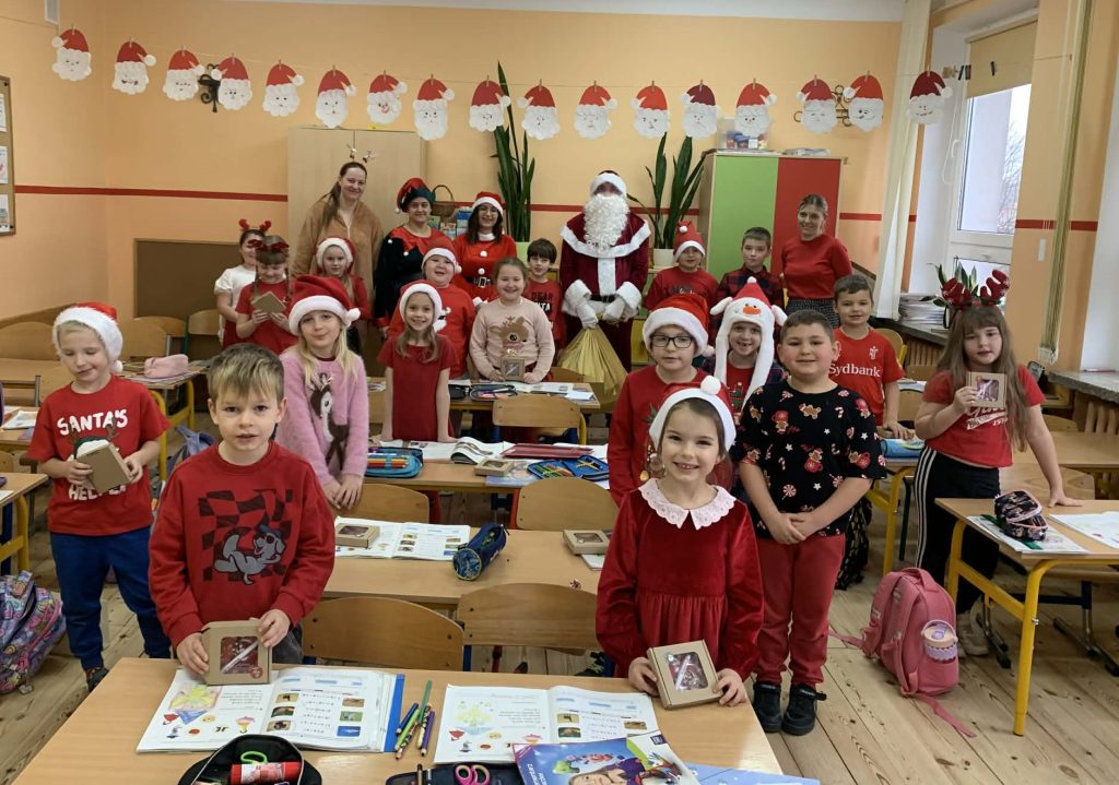 Nagle w drzwiach pojawił się prawdziwy Mikołaj! Nie przyszedł sam – towarzyszyła mu Pani Mikołajowa, Elf oraz Renifer, którzy od progu machali do dzieci i wnosili do klasy jeszcze więcej świątecznej magii. Wszyscy wyglądali bajecznie i od razu wywołali ogromne poruszenie wśród pierwszaków. Okazało się, że przybyli oni saniami, w których wieźli wielkie worek pełne prezentów – nie tylko dla wszystkich uczniów, ale także dla nauczycieli oraz pracowników szkoły. Radość była ogromna.
