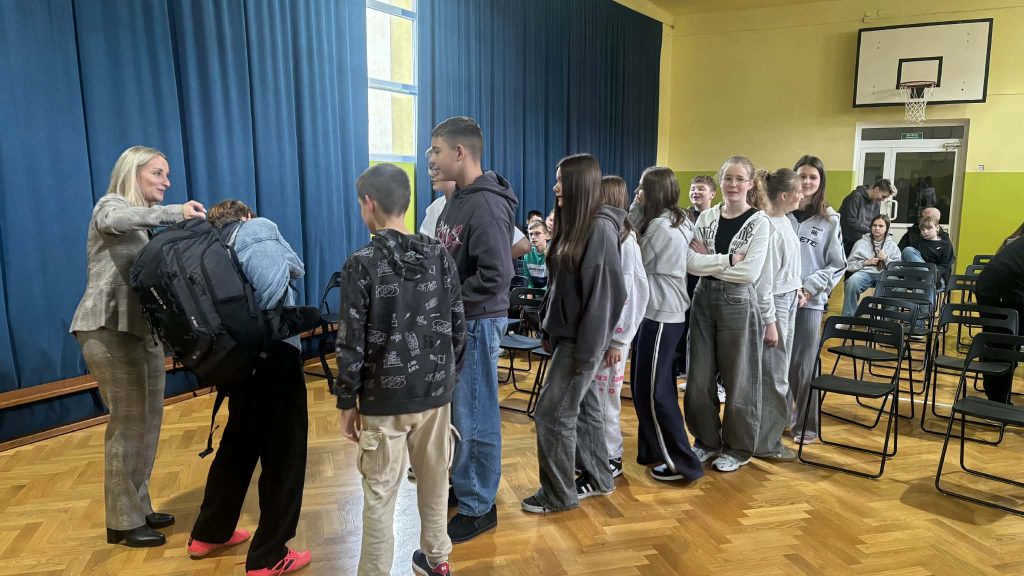 Uczniowie mogli poznać i zobaczyć zawartość plecaka, w który warto być wyposażonym w sytuacji zagrożenia bezpieczeństwa, mogli go także przymierzyć.