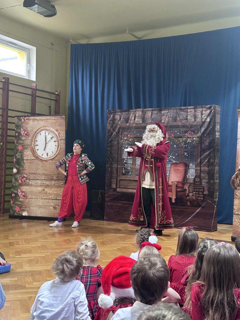 W naszych grupach przedszkolnych miały miejsce Wigilie grupowe, podczas których dzieci dzieliły się opłatkiem, składały sobie serdeczne życzenia, śpiewały kolędy oraz kosztowały świątecznych smakołyków. Ale to jeszcze nie koniec niespodzianek! Dzieci miały również okazję wziąć udział w wyjątkowym spektaklu teatralnym pt. „Co się stało z Mikołajem?”. Wspólnie z zabawnym Skrzatem Bąblem wyruszyły na poszukiwania zaginionego Świętego Mikołaja. Dzięki temu pełnemu przygód przedstawieniu udało się go odnaleźć! Na pamiątkę tego niezwykłego spotkania każda grupa wykonała wspólne zdjęcie, które już zdobi naszą przedszkolną galerię.